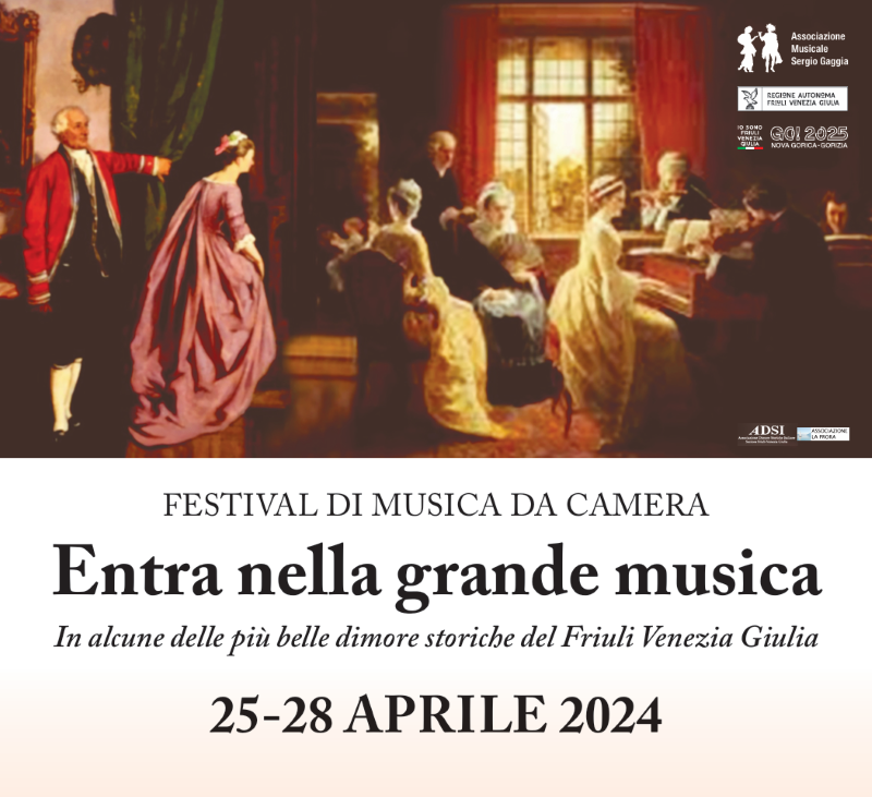 Dal 25 al 28 di aprile 2024 si svolgono i 4 concerti cameristici di Entra nella grande musica, con i quali l’Associazione Sergio Gaggia collabora per il secondo anno con il festival Entra nella Storia in una rinnovata sinergia con ADSI del Friuli Venezia Giulia. Le quattro serate musicali a tema sono accolte e valorizzate dagli spazi architettonicamente pregevoli e acusticamente ideali di alcune delle più belle dimore storiche della nostra regione. Si evoca in questo modo il contesto mitteleuropeo della Hausmusik e Salonmusik, che partendo dalla Vienna schubertiana di due secoli fa attecchì anche nella nostra regione. La Gaggia prosegue così una tradizione che ha fatto parte fin dall’inizio del suo DNA anche grazie ai contatti propiziati da uno dei nostri soci fondatori, Gianguido de Carvalho, amico che non è più con noi da qualche anno e che tuttora rimpiangiamo. Per le quattro giornate musicali è stata invitata una compagine internazionale di grande livello in parte già conosciuta e amata dal nostro pubblico per le loro performance nei Corsi estivi cividalesi. Riavremo con noi gli olandesi Daniel Rowland al violino, Floor Le Coultre alla viola e violino assieme alla serba Maja Bogdanovic al violoncello che talvolta saranno coadiuvati da Andrea Rucli al pianoforte e Marcello Bon al contrabbasso. L’arte e la comunicativa sul palco dei nostri ospiti garantisce un’altissima qualità oltre che a freschezza interpretativa, da sempre marchio delle nostre progettualità e inoltre tutti i programmi musicali posseggono un fil rouge che coniuga proposte di spessore e immediata fruibilità. Ecco la descrizione delle singole serate.